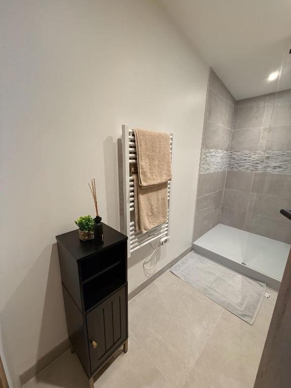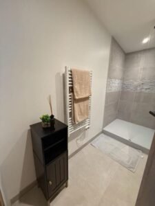 La chambre à coucher, calme et accueillante, garantit repos et tranquillité. Vous bénéficierez également d’une salle de douche moderne, accompagnée de WC indépendants, pour plus de confort et d’intimité. Une connexion WIFI gratuite est bien entendu incluse, idéale pour le télétravail ou le divertissement.